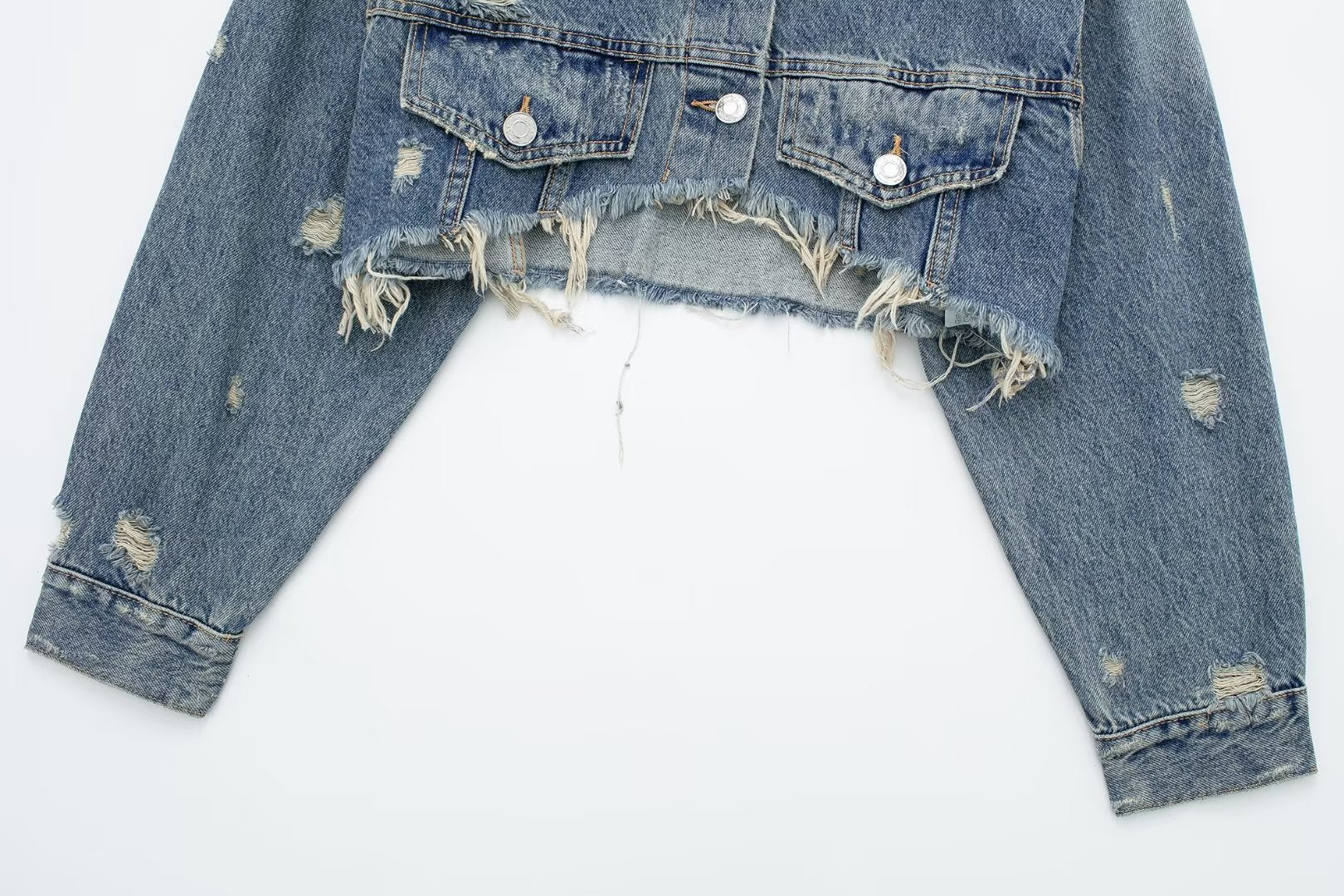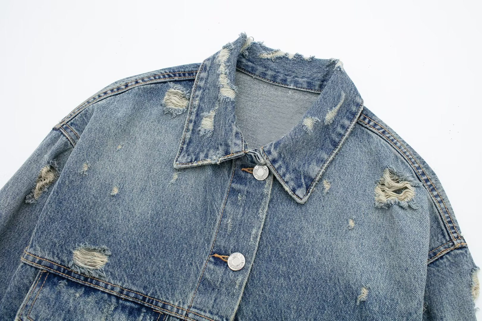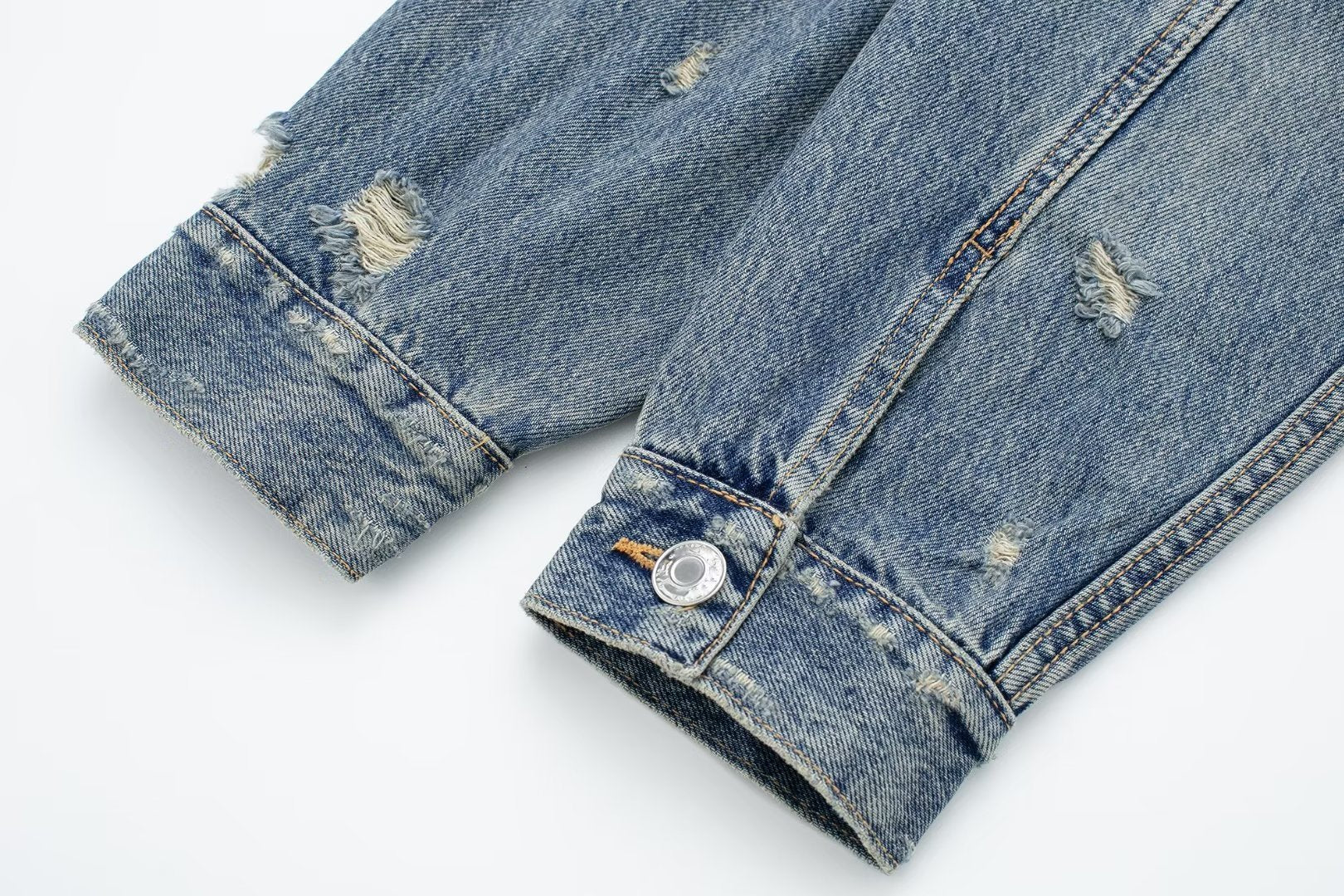 The Denim Perforated Hole Decoration Short Jacket brings edgy streetwear style to your wardrobe. Made from high-quality cotton, it offers both comfort and durability while maintaining a fashionable, relaxed fit. The perforated hole design adds a bold, distressed touch that perfectly complements its short, casual cut.