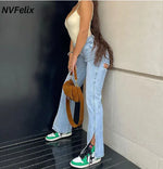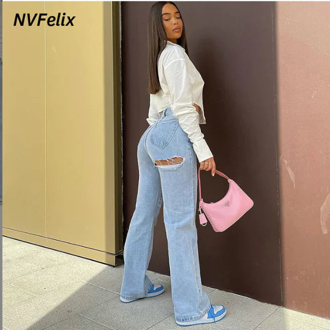 These blue ripped flared jeans combine vintage flair with modern style, featuring a flattering high waist and split hem design. Made from durable, medium-weight denim, they offer comfort and confidence for both casual and dressy looks.
