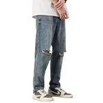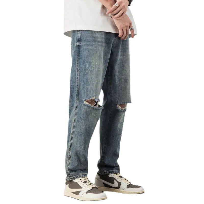 Step out in style with these distressed blue denim jeans, designed for teenagers who want to make a statement. The vintage distressed details capture modern street fashion, giving your outfit a trendy, edgy vibe. Tailored with a straight leg hem, these jeans provide a flattering and versatile fit, making them perfect for pairing with casual tees, hoodies, or dressier tops.